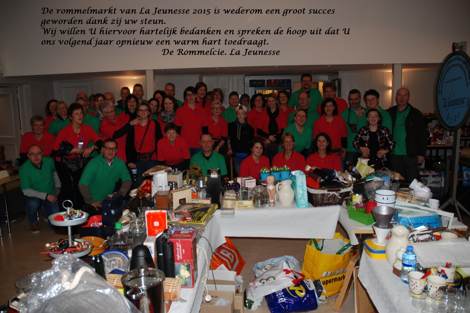 La Jeunesse kan terug kijken op een geslaagde rommelmert en hoopt het laatste weekend van januari 2016 weer op uw steun te kunnen rekenen zodat het koor, maar ook U voor de 22ste keer een slag kan slaan.